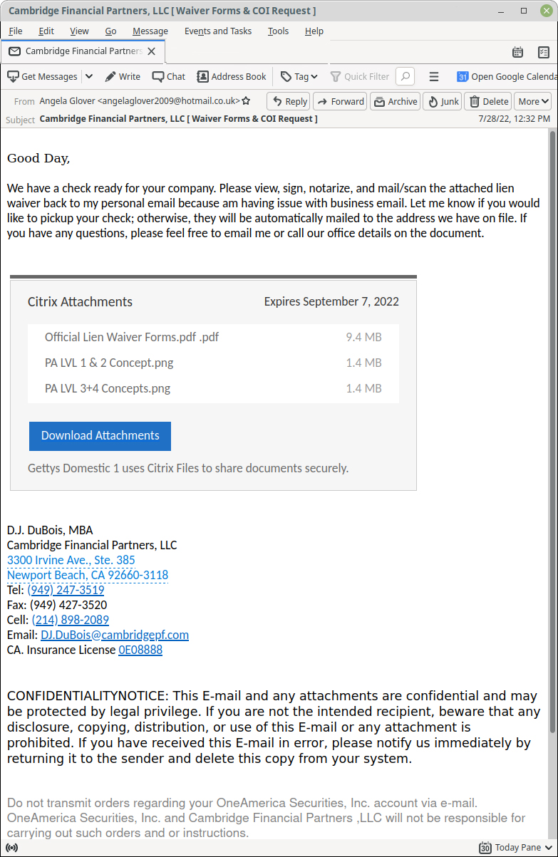 Unlike spear-phishing attacks, scammers may use informal and urgent text to manipulate readers into downloading a malicious attachment, opening an unsafe link, or disclosing private information such as credit card details.