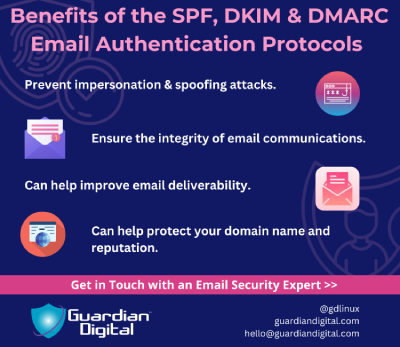 An email is authenticated through SPF, DMARC, and DKIM, whose processes confirm a message’s legitimacy and integrity during message delivery. All three protocols work in harmony to counteract phishing and message impersonation attacks.