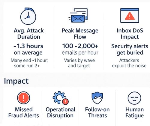 They’re usually short and aggressive. Most run about an hour, sometimes a little more. Data we’ve seen shows an average of roughly 1.3 hours, but high-volume campaigns can push beyond two hours. Rates of 600–1,000 emails per hour are common; in extreme cases, the pace jumps over 2,000, burying anything else that lands in the inbox.