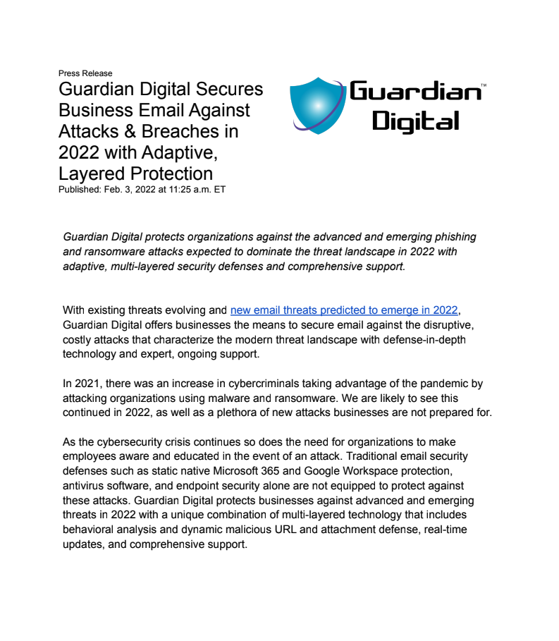 Guardian Digital protects organizations against the advanced and emerging phishing and ransomware attacks expected to dominate the threat landscape in 2022 with adaptive, multi-layered security defenses and comprehensive support.