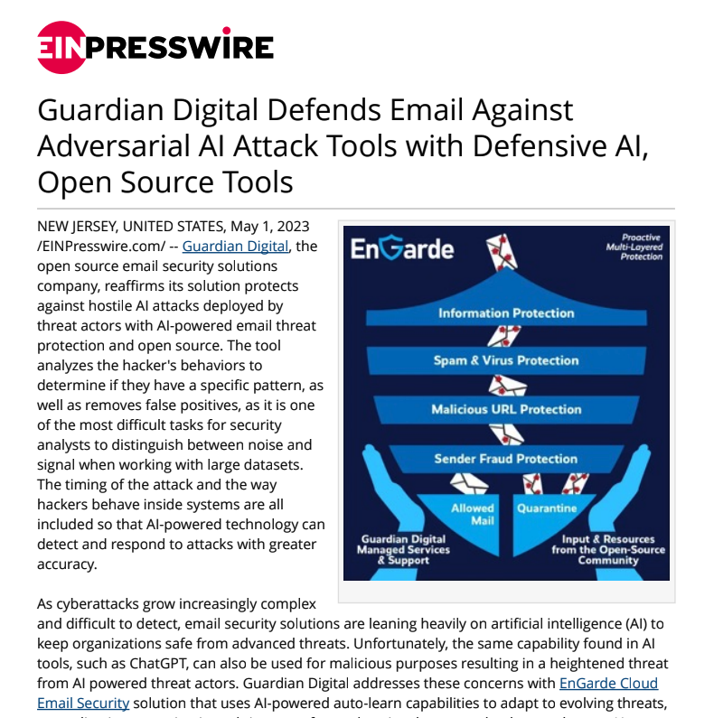 Guardian Digital, the open source email security solutions company, reaffirms its solution protects against hostile AI attacks deployed by threat actors with AI-powered email threat protection and open source. The tool analyzes the hacker's behaviors to determine if they have a specific pattern, as well as removes false positives, as it is one of the most difficult tasks for security analysts to distinguish between noise and signal when working with large datasets.