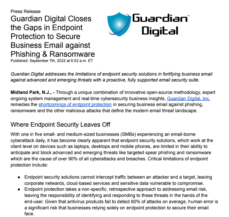 Guardian Digital addresses the limitations of endpoint security solutions in fortifying business email
