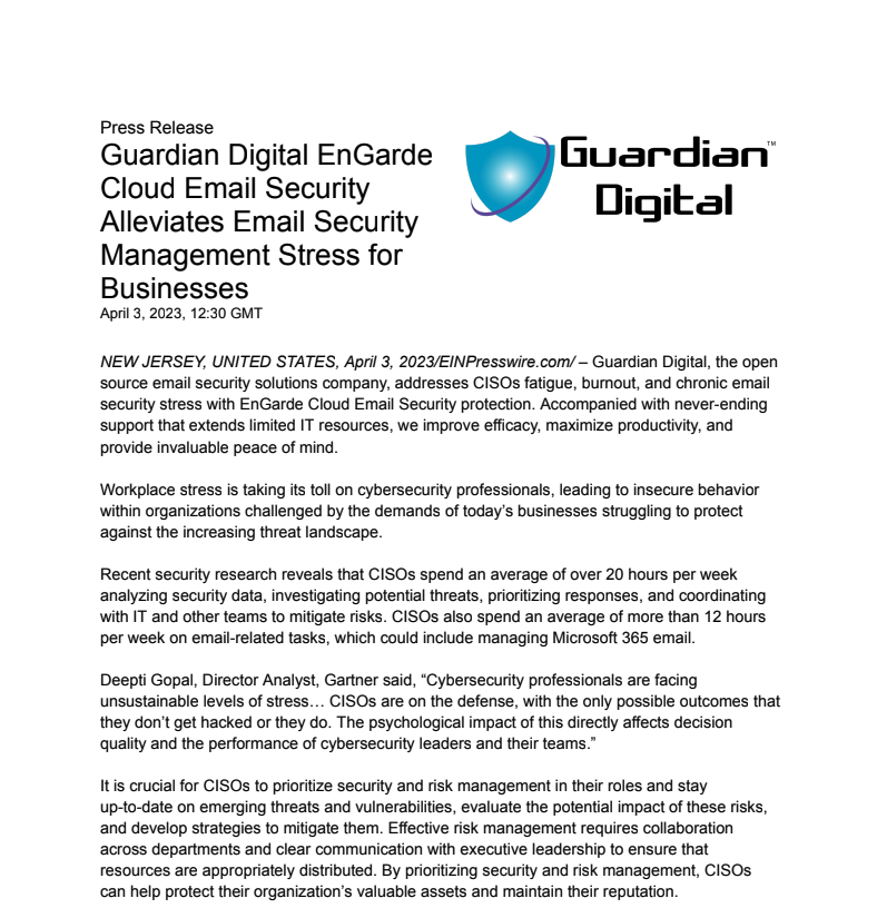 Guardian Digital, the open source email security solutions company, addresses CISOs fatigue, burnout, and chronic email security stress with EnGarde Cloud Email Security protection. Accompanied with never-ending support that extends limited IT resources, we improve efficacy, maximize productivity, and provide invaluable peace of mind.