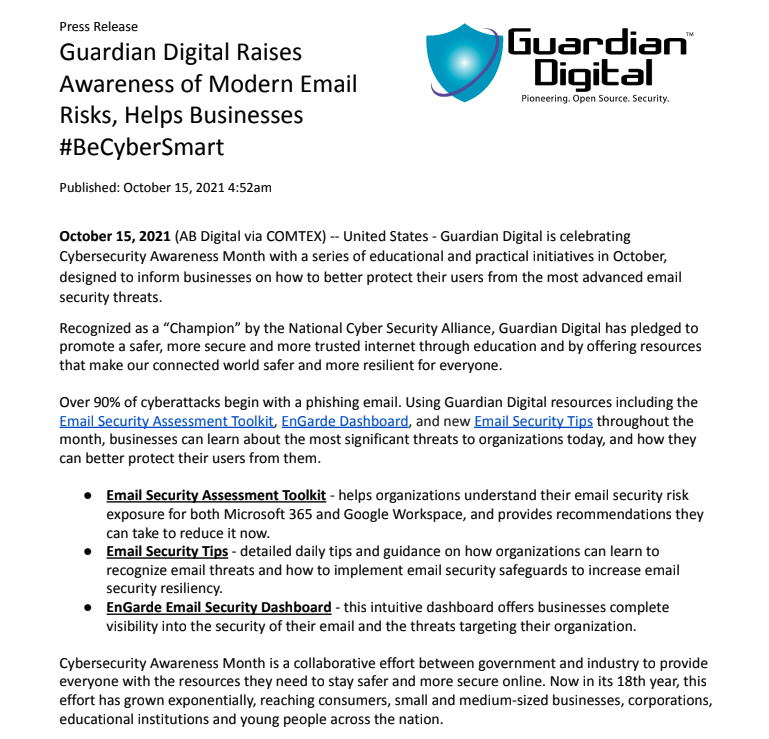 Guardian Digital is celebrating Cybersecurity Awareness Month with a series of educational and practical initiatives in October, designed to inform businesses on how to better protect their users from the most advanced email security threats.