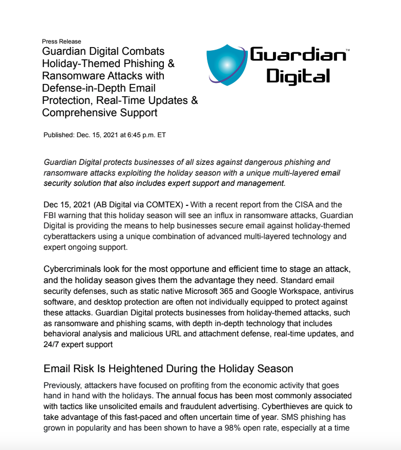 Guardian Digital protects businesses of all sizes against dangerous phishing and ransomware attacks exploiting the holiday season with a unique multi-layered email security solution that also includes expert support and management.