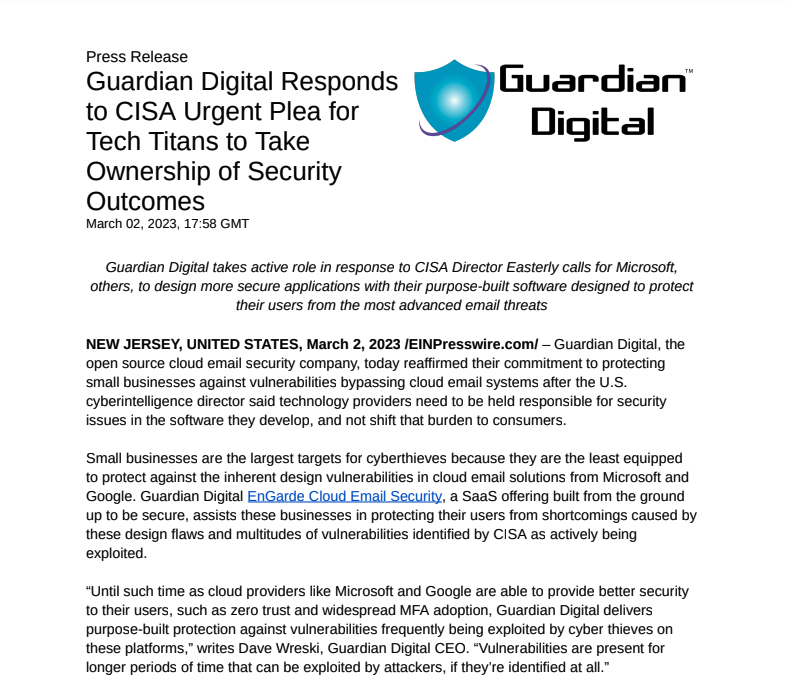 Guardian Digital takes active role in response to CISA Director Easterly calls for Microsoft, others, to design more secure applications with their purpose-built software designed to protect their users from the most advanced email threats.