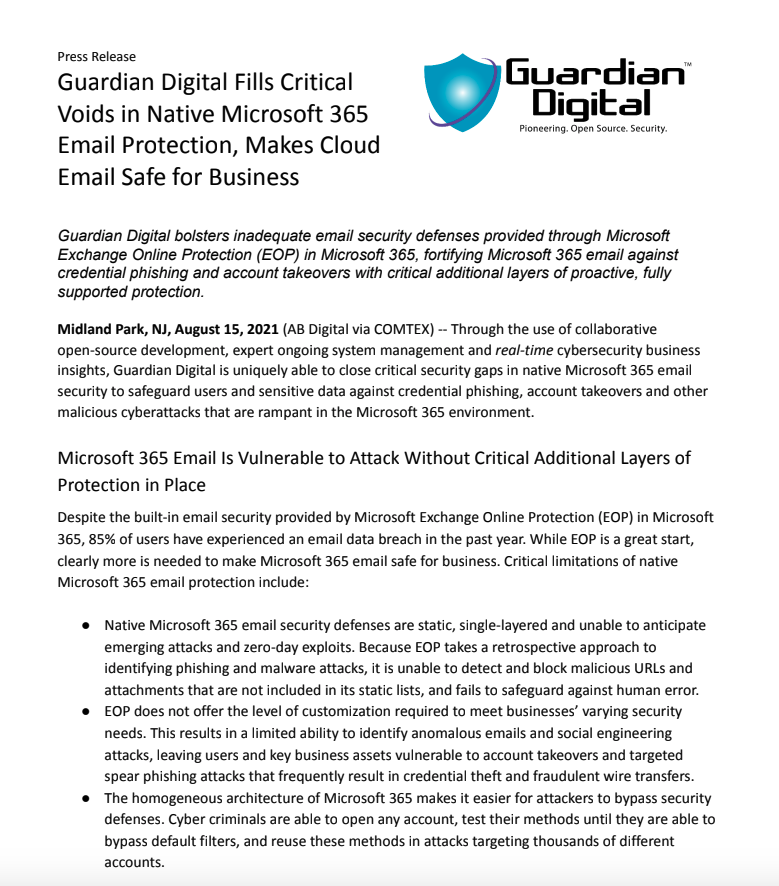 Guardian Digital bolsters inadequate email security defenses provided through Microsoft