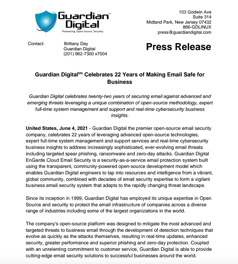 Guardian Digital celebrates twenty-two years of securing email against advanced and emerging threats leveraging a unique combination of open-source methodology, expert full-time system management and support and real-time cybersecurity business insights.